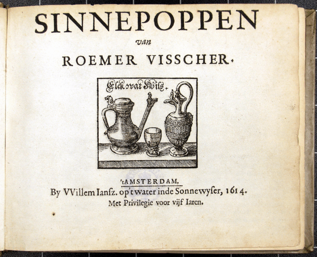 Roemer Visscher gaf aan zijn kinderen een voor die tijd (rond 1600) moderne, veelzijdige en vooral kunstzinnige opvoeding. Zijn dochters Anna en Maria Tesselschade maakten beiden naam als dichteres. Pas op latere leeftijd gaf Roemer Visscher zijn literaire werk in gedrukte vorm uit met als hoogtepunt de emblematabundel ‘Sinnepoppen uit’1614. Het is een verzameling veelal moraliserende zin-spreuken (Sinnepoppen) vergezeld van een prent en een verklarende tekst. De prenten werden vervaardigd door Claes Jansz. Visscher. Een voorbeeld uit deze bundel is Elck zijn waerom [ieder heeft zijn reden om iets wel of niet te doen], een zinspreuk bedacht door zijn dochter Maria Tesselschade: